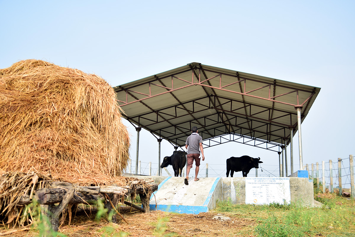 During the 2017 floods, around 30 households evacuated their livestock to the community shed which has been built on land that sits about 15 feet above the ground level. The shed is a real community affair. It is built on land donated by Dhani Ram Tharu, a local community member, while other villagers contributed with labour to build the raised shed.