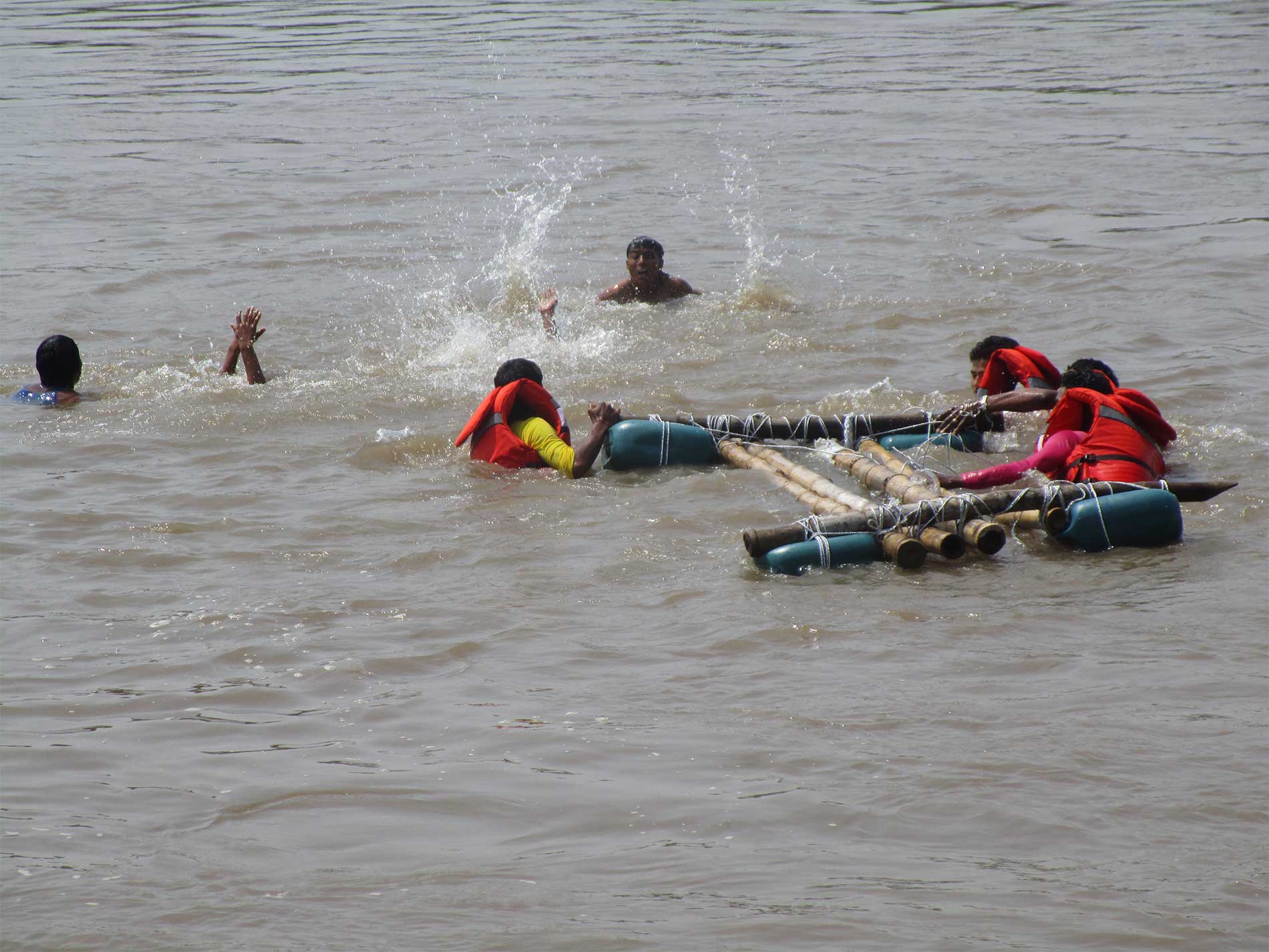 Dozens of people appear to be stuck in the swelling Karnali River and need to be rescued. Trained volunteers rush to the scene with life jackets, ropes, and tubes. Here begins a long and arduous rescue mission. Ropes are fixed to safely guide the stranded out of the river while a few good swimmers stand by the riverbank. One by one, people are brought back to safety and the panicked cries turn into cheers.