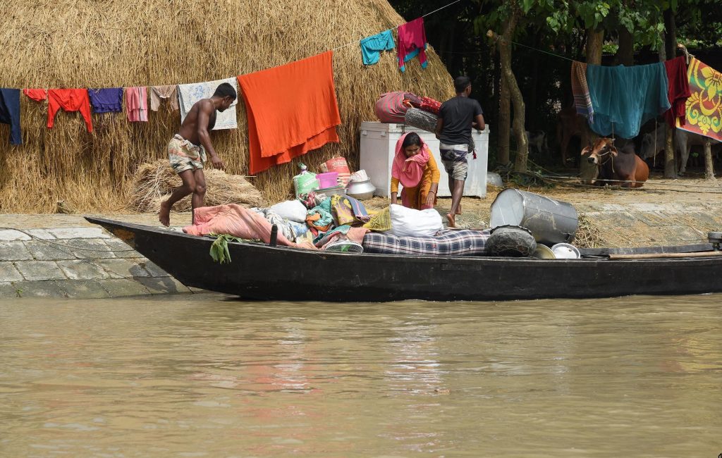 Below right - People in the Rajshahi district of Bangladesh moving to a safer place with their valuables and domestic animals during the 2020 floods.