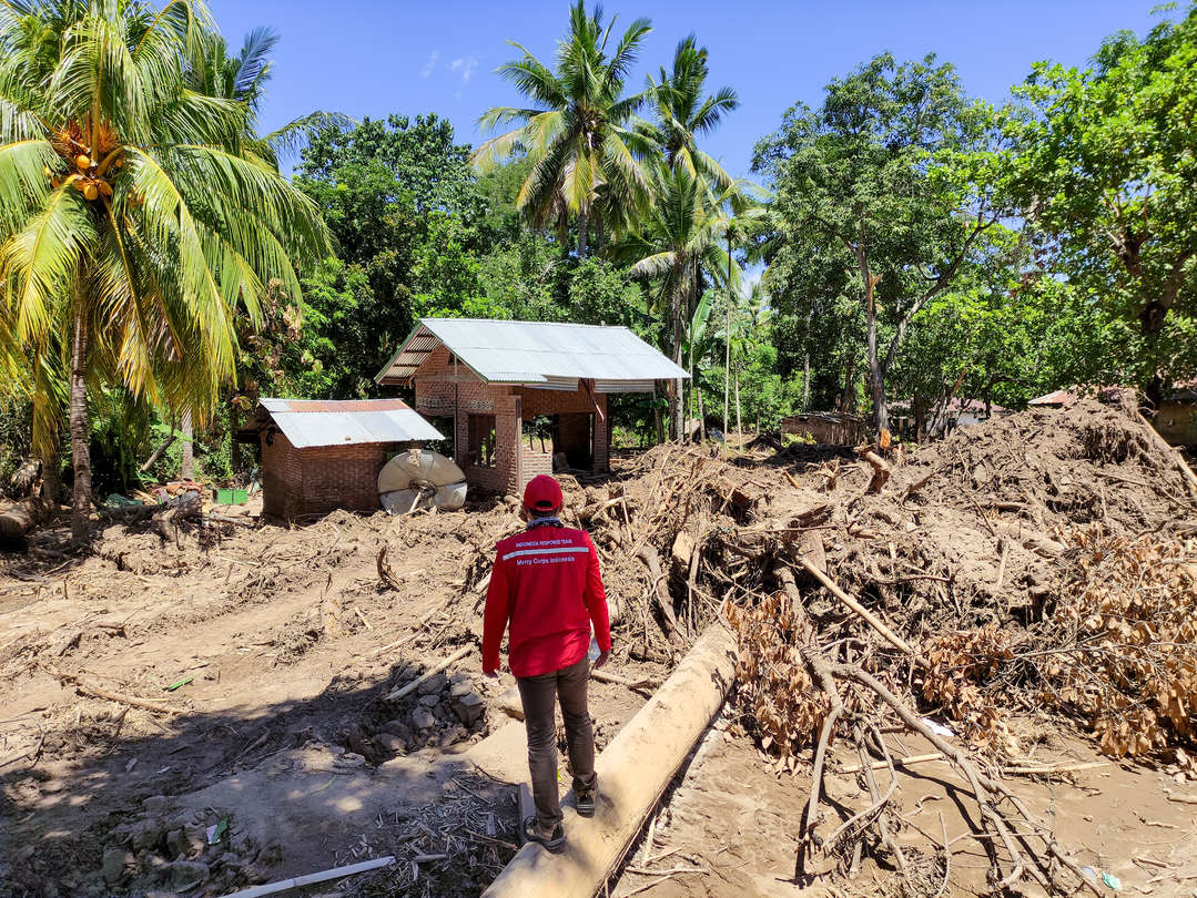Left - A member of Mercy Corps' response team in Indonesia surveys the damage caused by the Seroja Tropical Cyclone in 2021, which destroyed vital infrastructure and displaced over 10,000 people.